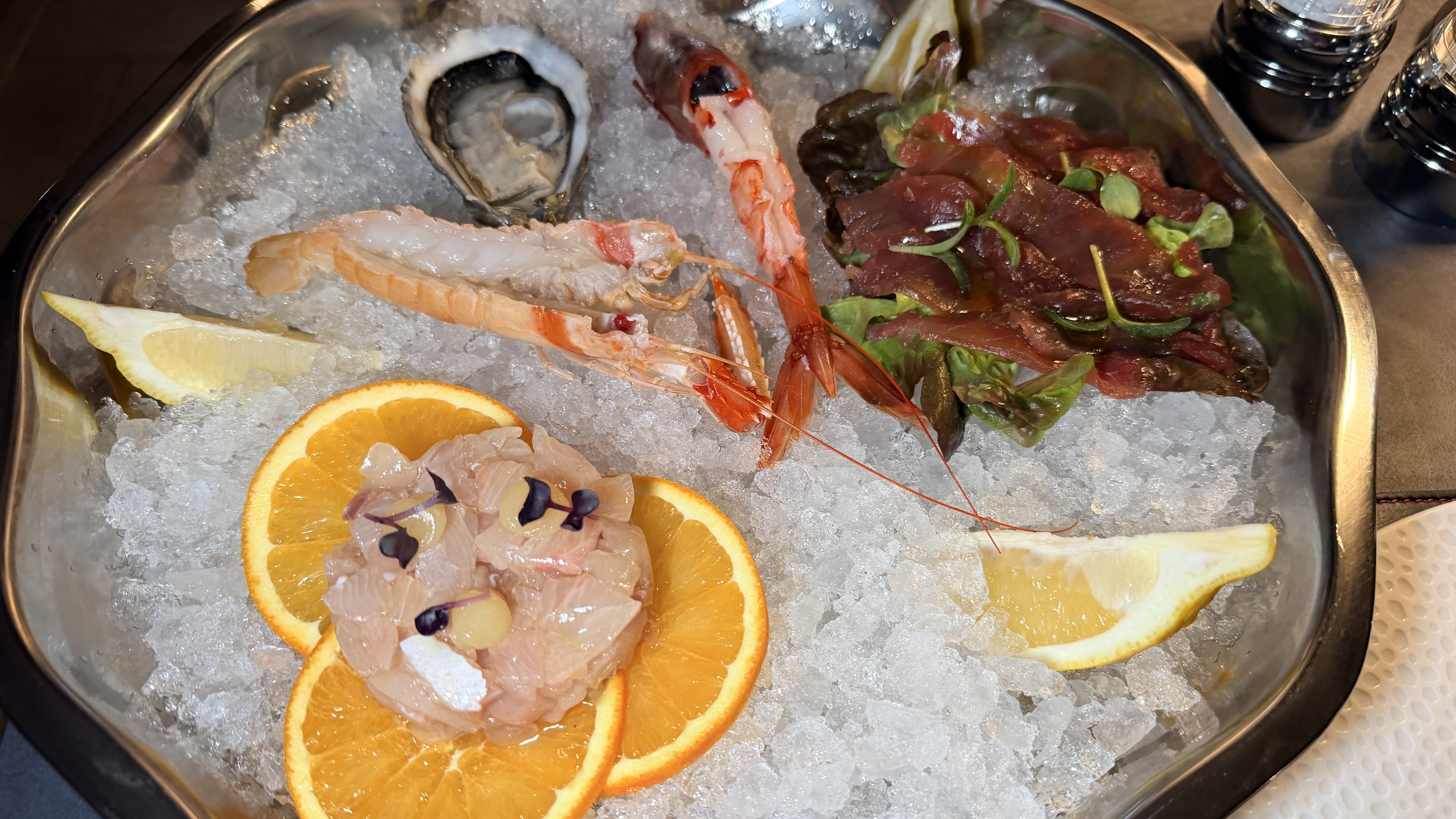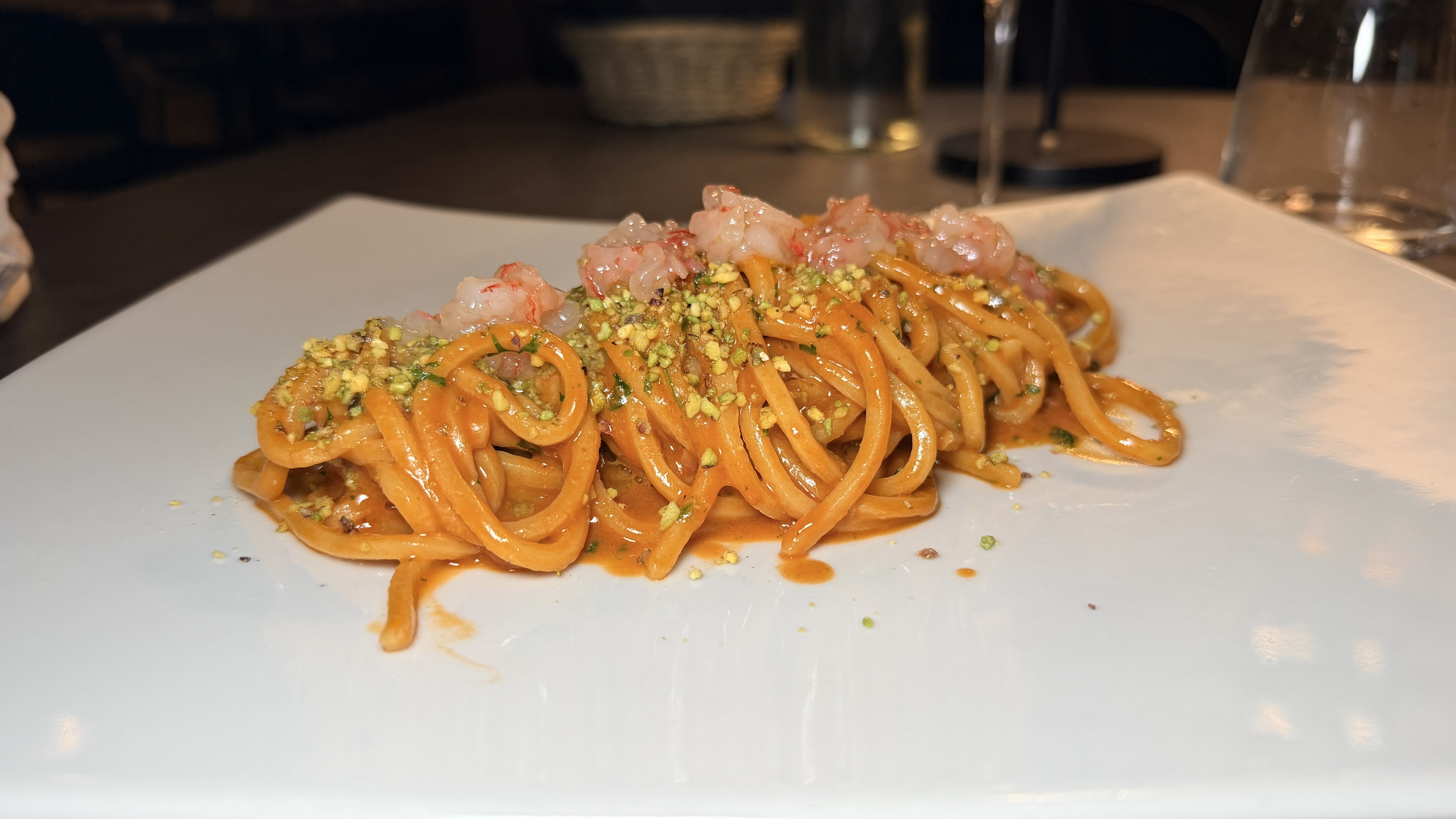 La Corte è il riflesso diretto del suo percorso. Un ristorante di mare nell’entroterra, dove il pesce arriva fresco ogni giorno e detta il ritmo del menu, che cambia spesso seguendo il mercato, la disponibilità e la stagionalità. Crudi, ostriche selezionate, primi che nel tempo sono diventati dei must (come il tonnarello con gambero rosso e pistacchio, o lo scialatiello ai frutti di mare) convivono con preparazioni essenziali, abbondanti, e rispettose del prodotto. Accanto al mare Gabriele non dimentica comunque la terra: formaggi, ortaggi e carni del territorio di Nepi entrano in carta per completare una proposta pensata per accogliere tutti, senza perdere coerenza e identità.