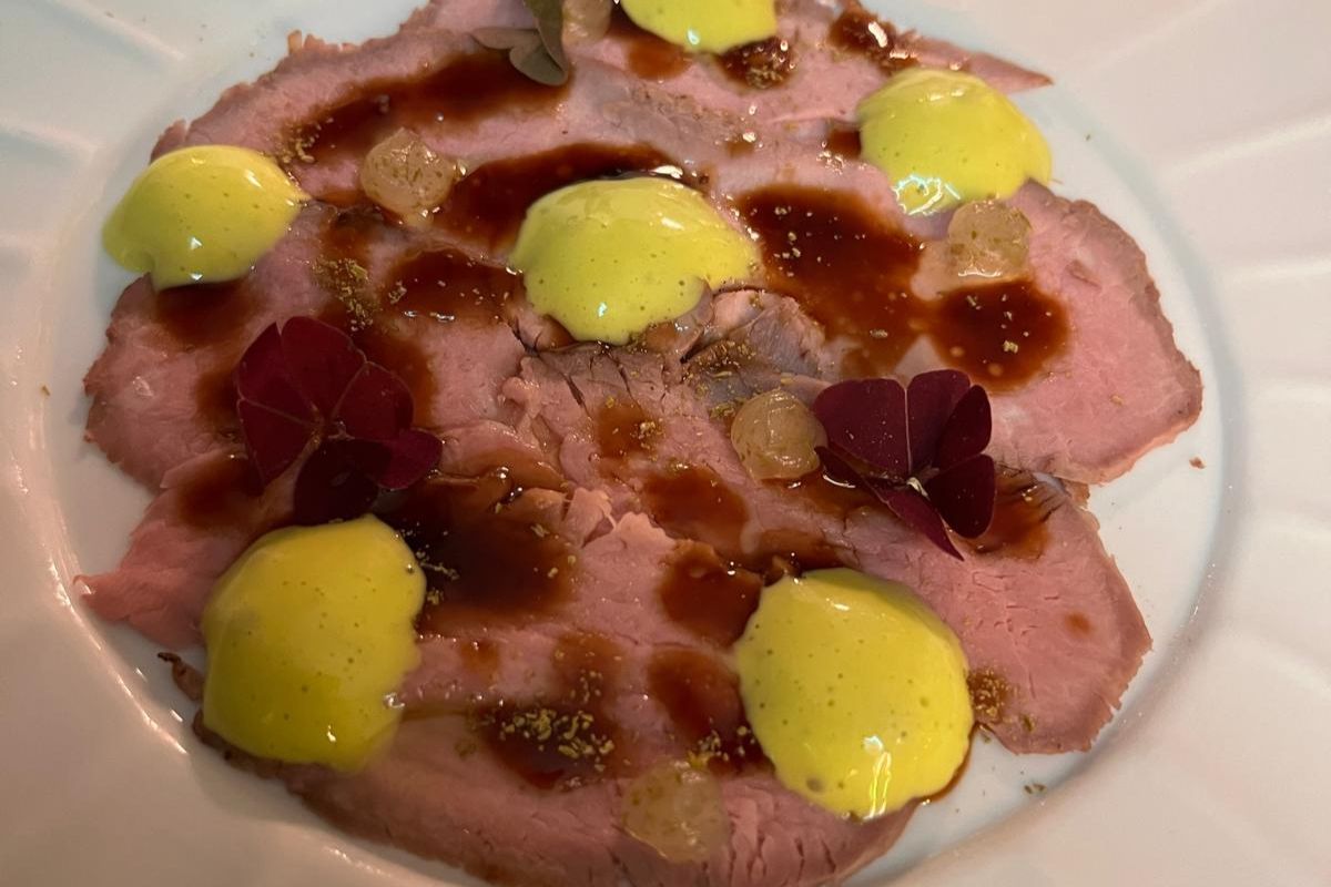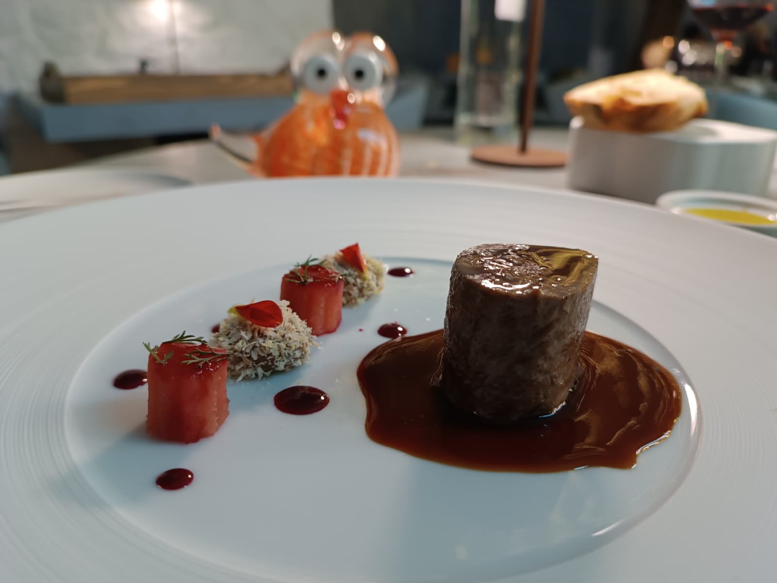 La prosecuzione stupisce ancora sia per il contrasto di sapori che per il gioco di colori che si crea nel piatto. Si tratta di gnocchi ripieni di arancia amara candita, prosciutto anatra essiccato e affumicato, olive in pesto di prezzemolo, una salsa allo zafferano profumatissima e delle foglioline di xalis verde. Questo piatto ha un accento carismatico, un richiamo alla cucina a cavallo fra Medioevo e Rinascimento, quando ancora i contrasti agrodolci erano forti e lo zafferano faceva da padrone nelle cucine dei nobili, rendendo dorate le pietanze dei banchetti. A questo piatto troviamo accostato un vino spagnolo, uno Zárate Albariño Rias Baixas, annata 2022, fresco e persistente, dall’aspetto quasi torbido si presenta all’olfatto affumicato poiché fa un passaggio nel legno e ricorda il tabacco o il fieno bruciato.
