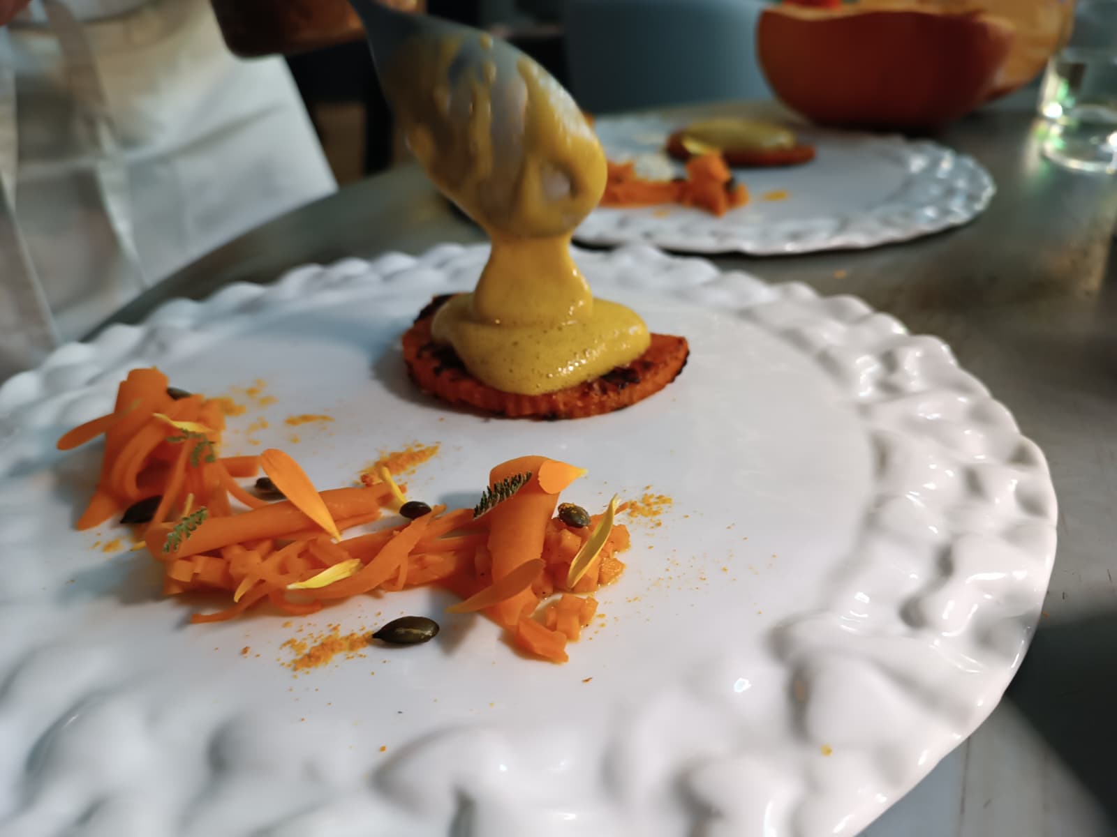La portata più scenografica della cena è sicuramente la zucca. Questa viene laccata con miso alla zucca e poi cotta alla brace, impiattata con un uno zabaione al tartufo. Di fianco, un’insalata di zucca fermentata, in agrodolce e in polvere, con foglie di artemisia che conferisce all’insieme una nota prepotente e amarognola. A completare il piatto già complesso un buñuelo croccante, ripieno di zucca e pralinato salato alla nocciola. Altra portata, altro wine pairing: è la volta del Purple Rose, del Castello di Ama, annata 2022, un rosé speziato, dal sentore di frutti di bosco come lampone e ribes, quasi balsamico grazie alle note di salvia e prezzemolino selvatico.