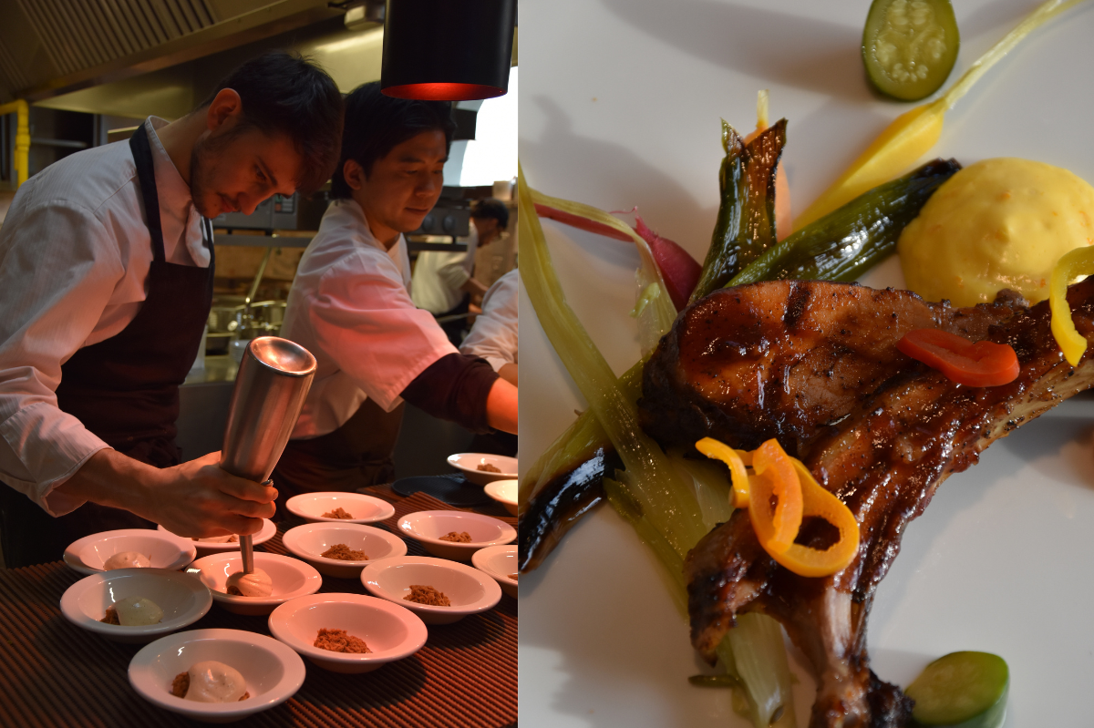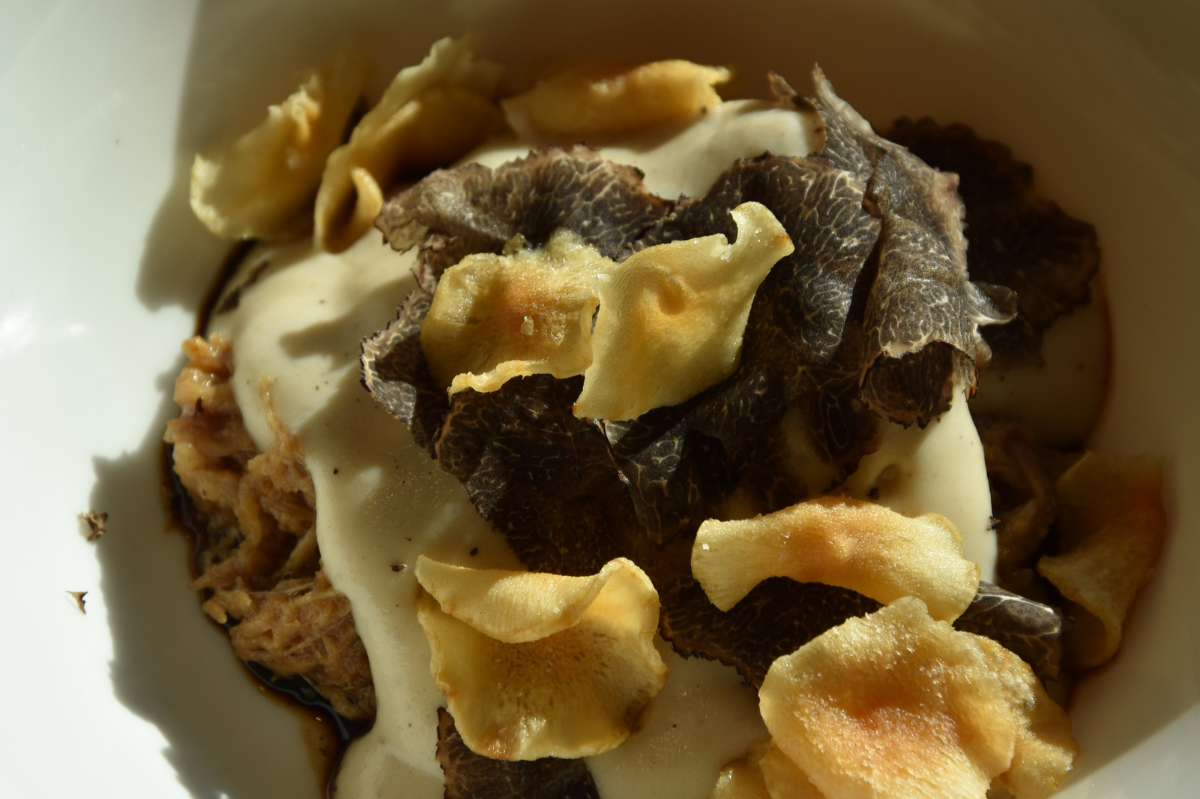 Si comincia con la sorprendente “Torta di Maiale al Cacao” dello chef Sato: un’interpretazione salata della pasticceria. Una frolla impeccabile, la sapidità piena del maiale e le note amare del cacao. Una fetta di crostata che evoca riflessi di selvaggina più che di suino. A seguire lo “Stracotto di Stinco” firmato chef Collazzo, servito con “Sifone di Topinambur e Caffè, Tartufo Nero”. La carne, tenerissima grazie alla lunga cottura, trova un perfetto contrappunto nel sentore nocciolato del topinambur e nelle note tostate del caffè.