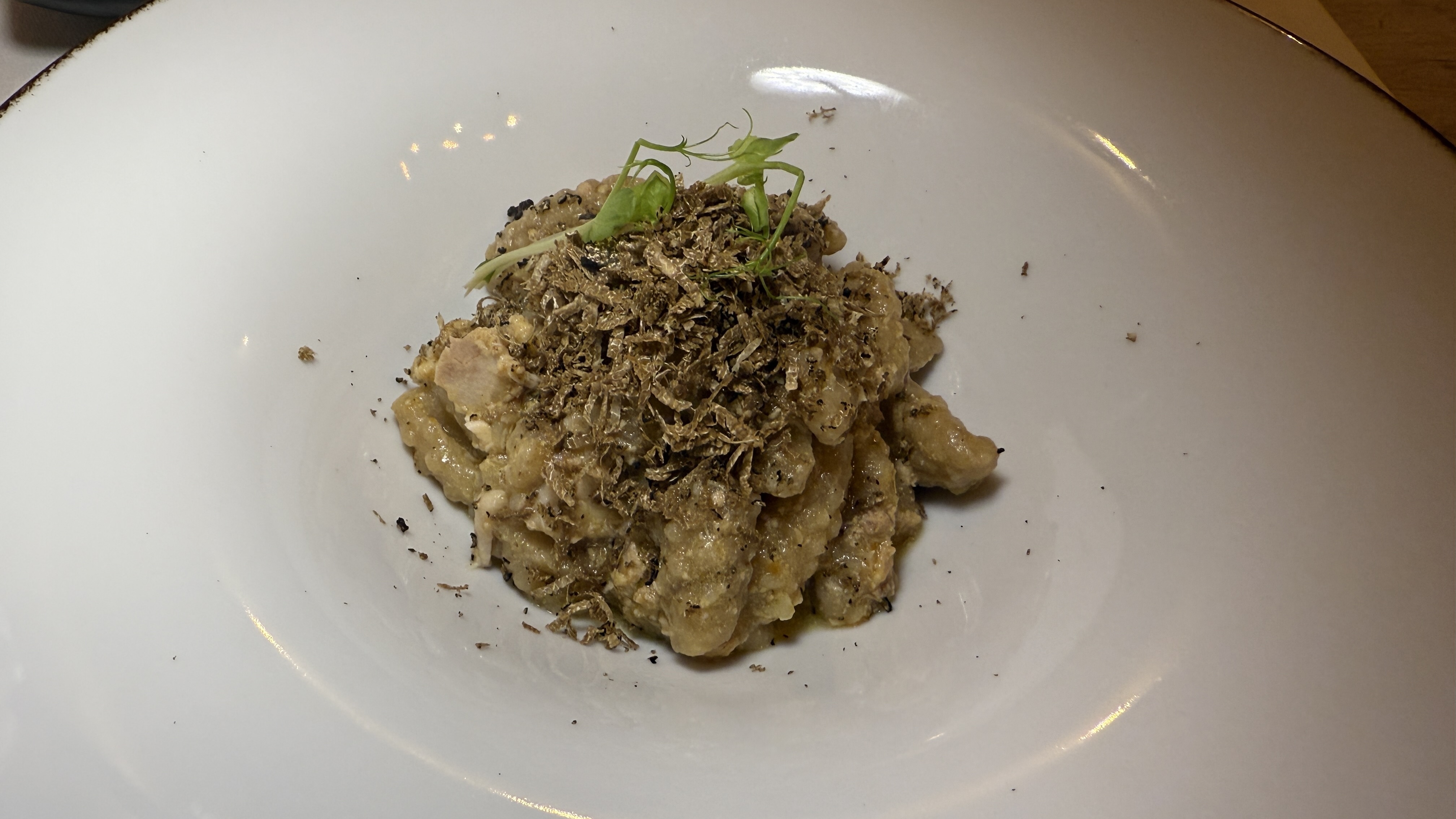 Si comincia con un grazioso appetizer: un finto mini pomodoro ripieno di pappa al pomodoro. La carta offre una buona scelta, per incontrare i gusti di tutti. Dalla carne al vegetariano: deliziosa la vellutata di cavolo viola e nella granny smith. Anche selezione di crudi con 4 diverse tipologie di tartare (fassona, marchigiana, scottona, piemontese). Sostanza la parola chiave dei primi, tra i quali compaiono paste fresche realizzate quotidianamente da Maria. Interessanti, comfort food vibes, gli strozzapreti al ragù domestico (pollo, coniglio e faraona) con abbondante tartufo. È poi il momento poi della faraona cotta a bassa temperatura, ripiena di castagne e salsiccia, con guanciale adagiato in superficie. Bella, abbondante, soddisfacente e ghiotta. Per gli amanti della carne più “strong”, anche una selezione di tagliate alla griglia.
