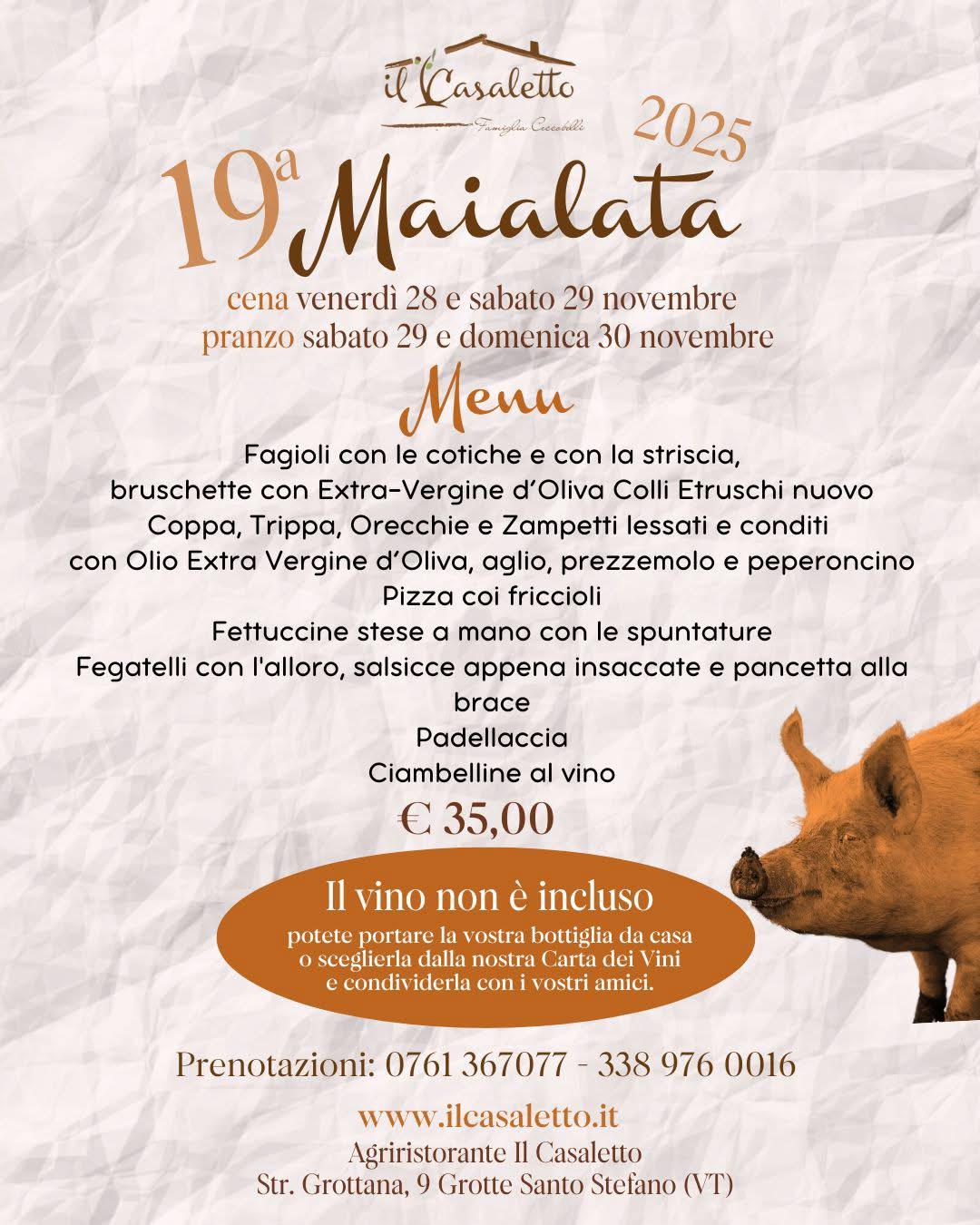 L’agriturismo Il Casaletto di Grotte Santo Stefano, fresco della nomina a miglior agriturismo del Lazio secondo il Gambero Rosso, celebra questo traguardo con l’evento che più di ogni altro incarna la sua storia e la sua identità: La Maialata, in programma venerdì, sabato e domenica. Una festa che è insieme rito antico, memoria condivisa e piacere autentico dello stare insieme. A raccontarne l’essenza è Marco Ceccobelli, proprietario e cuoco, che ripercorre i ricordi di quando Il Casaletto era ancora un semplice ricovero agricolo. Le famiglie si ritrovavano all’alba, nel freddo pungente dei giorni vicini al Natale, per accendere il grande focolare e dare inizio a un lavoro che era fatica ma anche comunità. “Sento ancora lo scricchiolio della terra gelata sotto gli stivaletti,” ricorda Marco, “e il buio che lasciava spazio alle prime luci quando arrivavano zii, cugini e nonni, ognuno con il proprio maiale”.