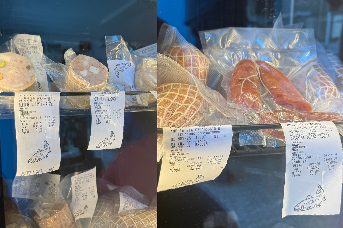 Tutto merito dell’ambizione e lungimiranza Thomas, il giovane titolare e figlio di chi nel 1997 in questo stesso posto aprì Sapore di Mare, (pescheria con banco del fresco e una piccola proposta di gastronomia). Dopo un periodo di esperienze che lo hanno formato come cuoco, nel 2021 ha deciso di tornare ad Amelia per riaprire la storica bottega ittica di famiglia, nel frattempo con le serrande abbassate, con l’obiettivo di trasformarla inserendo una cucina, uno spazio di street food e, soprattutto, la produzione di salumi di mare. L’idea è nata osservando la tendenza della frollatura del pesce, sempre più diffusa negli ultimi anni. Se alcuni chef trattavano già il pesce come la carne, il titolare ha pensato di adattare le tecniche della norcineria tradizionale al mondo marino, dando vita al progetto di una vera e propria “salumeria ittica”.