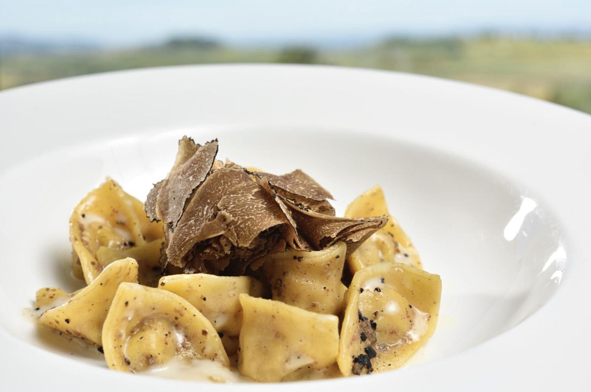 La proposta: Cappellacci al prosciutto di Norcia. Un signature dish presente dal suo arrivo sette anni fa e ancora oggi il più venduto del ristorante. Cappellacci ripieni di prosciutto di Norcia, serviti con fonduta di Parmigiano e tartufo nero. Un piatto disponibile da settembre a marzo, che celebra profumi e ingredienti tipici umbri.